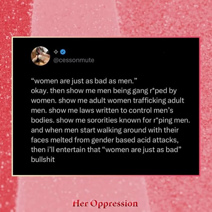 Challenging these ideas is liberation, but will be called an attack on men/masculinity and an erosion of society. The manosphere chodes will do their best to fight against it.